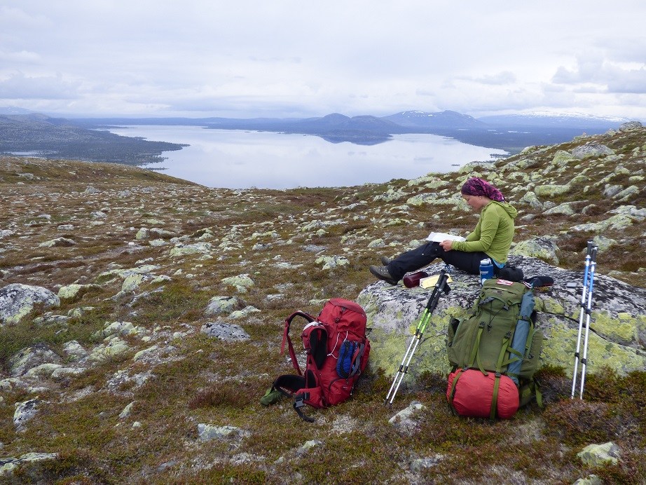 Vi er kommet så godt fra start som man overhovedet kan ønske sig. Med 20 kilo i Elsas rygsæk og 25 i Rasmus’ lagde vi ud fra Grövelsjön i høj sol og ikke en sky på himlen og med milevid udsigt ind over Norges fjelde. Da vi startede turen ved 19-tiden om aftenen gik vi bare 3-4 km op i fjeldet os slog vores første lejr op – og kunne sidde udenfor teltet med solskin på bare arme og ben kl 22 mens en behagelig brise holdt alle myg udenfor syns- og stikkevidde.